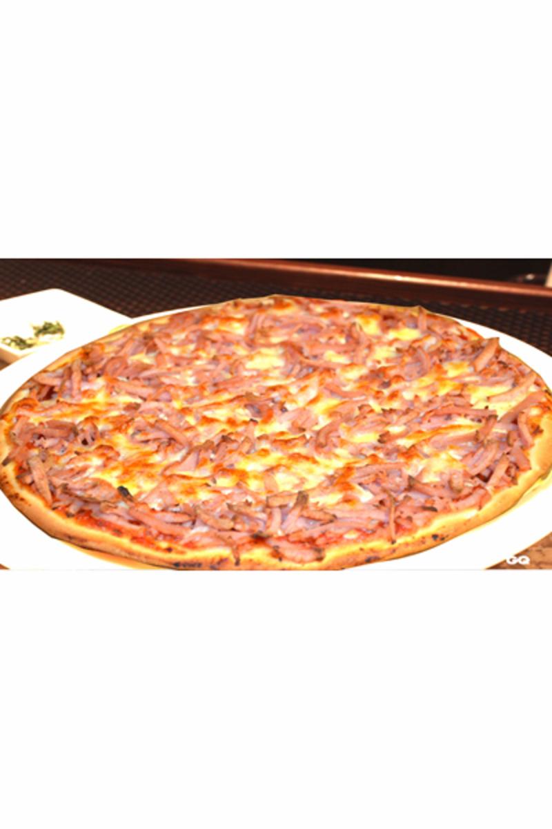 Tomatsaus, ost og skinke. Allergen: Gluten og melk