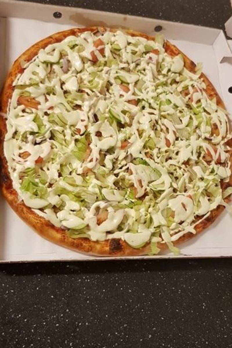 Tomatsaus, ost, kebabkjøtt (Salat, tomat agurk, løk og hvitløks dressing på toppen) Gluten, melk, soya og egg