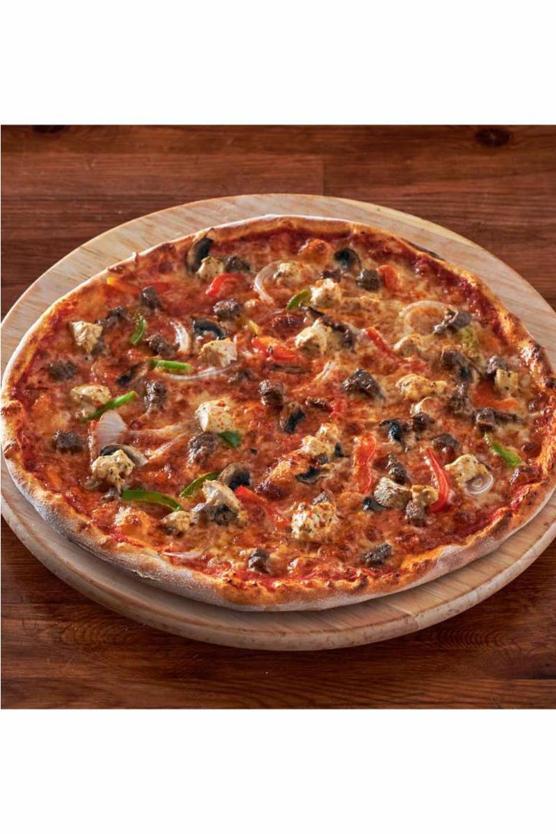 Tomatsaus, ost, biffkjøtt, kyllingkjøtt, kjøttdeig, paprika, løk og sjampinjong Gluten, melk, soya