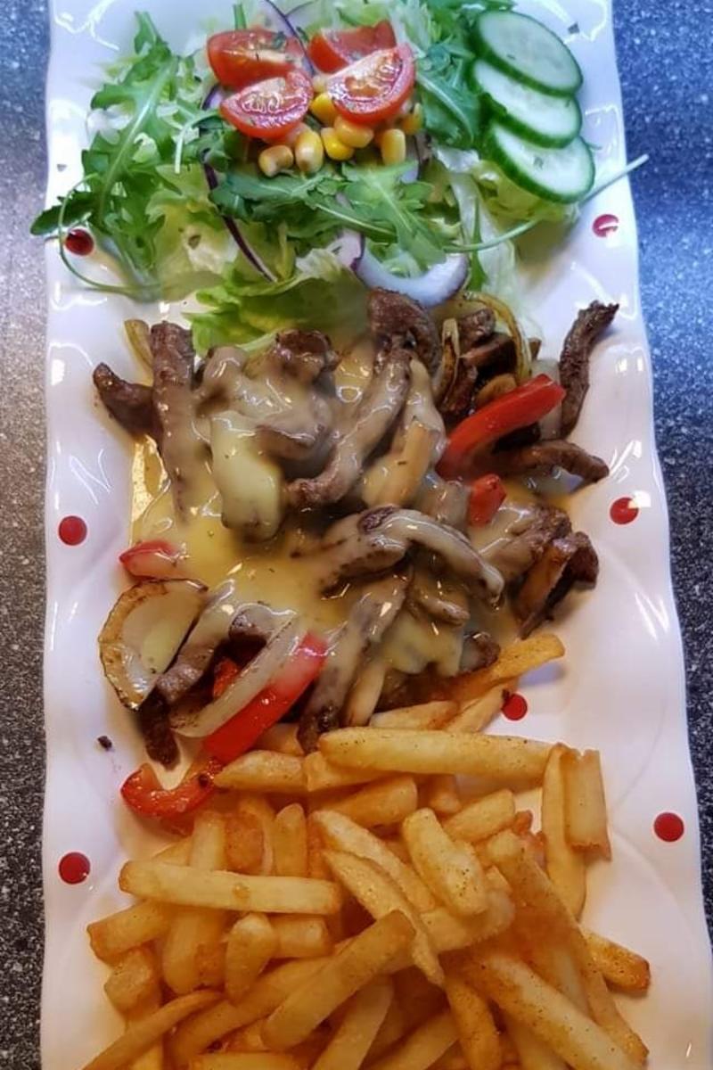 Strimlet kjøtt, løk,paprika, sjampinjong, jalapenos, salat, pommes frites og peppersaus Allergen: soya melk og egg