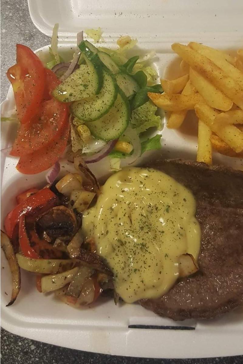 Løvstek med bearnaisesaus, salat, dressing og pommes frites Allergen: melk og egg