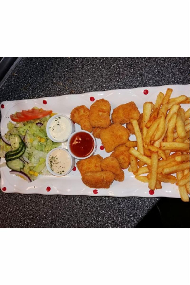 8 stk.Kylling nugets, salat, dressing og pommes frites Allergen: melk og egg