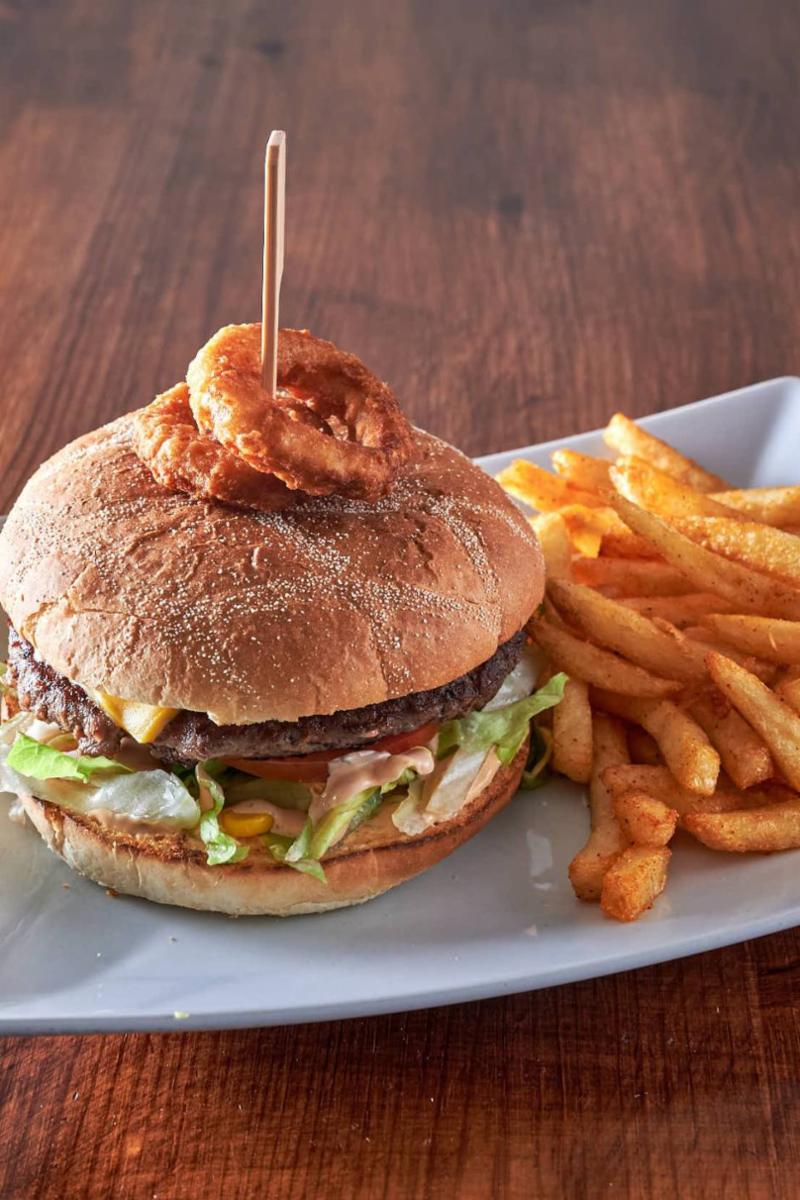 Burger, pommes frites, salat, dressing, mais, tomat, løk og sylte agurk + 0,5l brus Allergen: Gluten, melk og egg og sesamfrø